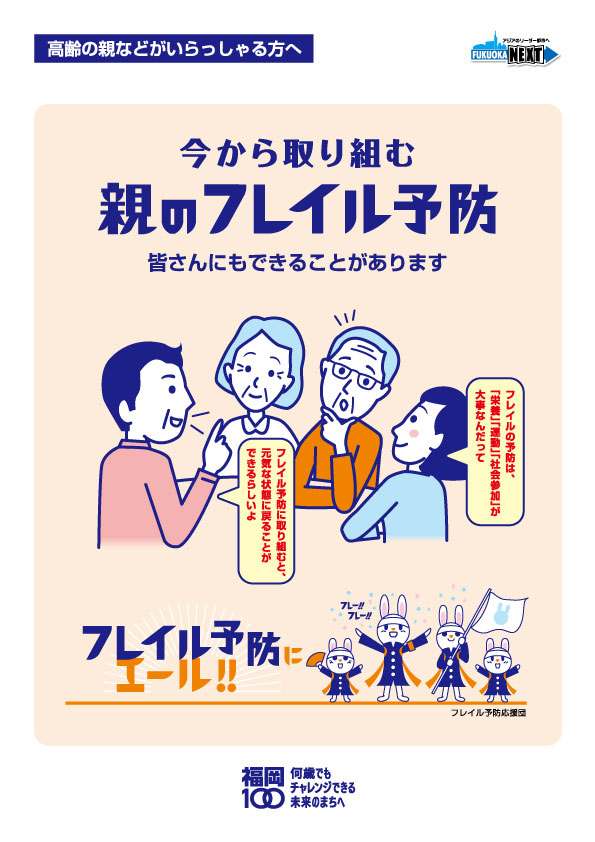 | 名称 | 福岡市フレイル予防ガイド | 今から取り組む親のフレイル予防 | 知ってる?フレイル | フレイル予防レシピ33 | 予防しよう!オーラルフレイル | いきいきシニアのための簡単運動メニューブック | 福岡市「みんなでよかトレ体操!」 |